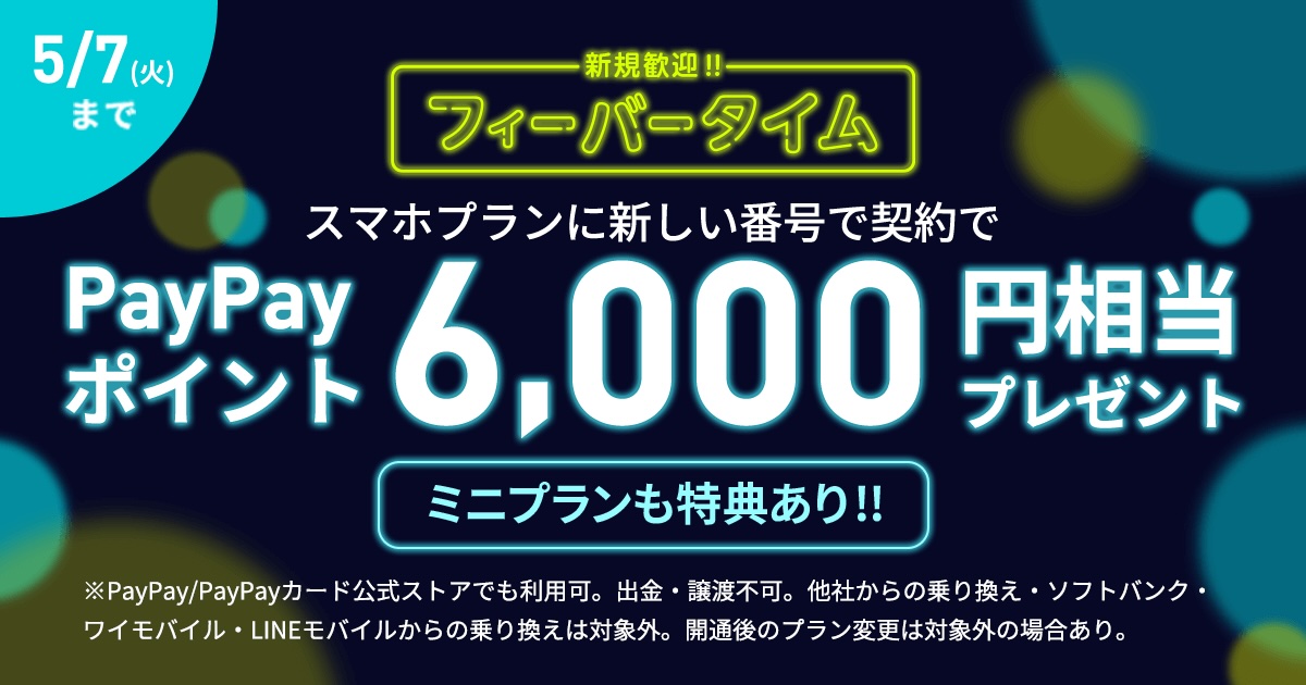 キャンペーン期間中にLINEMOのスマホプランを新規契約した場合に6,000ポイント、ミニプランを新規契約した場合に3,000ポイントをプレゼントします。特典はPayPayギフトカードをLINEMOのオンラインサポート「My Menu」に登録してあるメールアドレスにメールまたは携帯電話番号にSMSにて送付し、PayPayギフトカード受け取り後に受取日を含めて30日以内にPayPayにチャージすることでPayPayポイントとして利用できます。