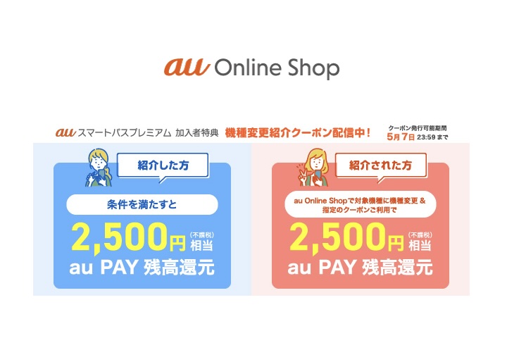 au Online Shop機種変更紹介キャンペーンが5月7日まで実施中!auスマートパスプレミアム会員の紹介した人と紹介された人に各々2500円分プレゼント