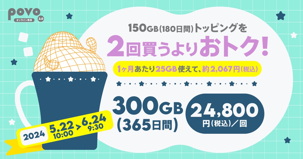 ・povo2.0、「データ追加300GB(365日間)」トッピングを6月24日まで提供