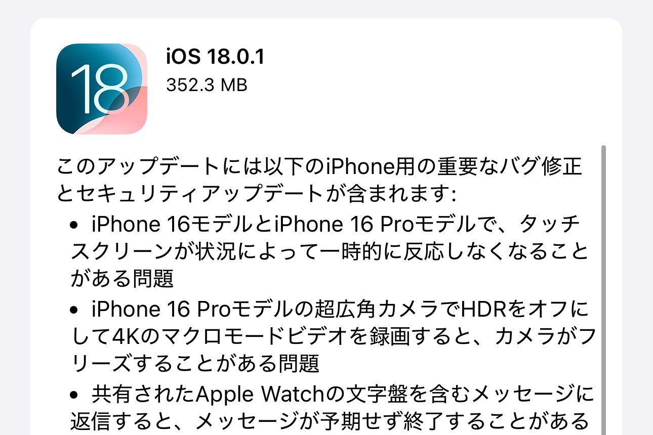 | AppleがiPhoneなど向けiOS 18.0.1とiPadOS 18.0.1をリリース! |