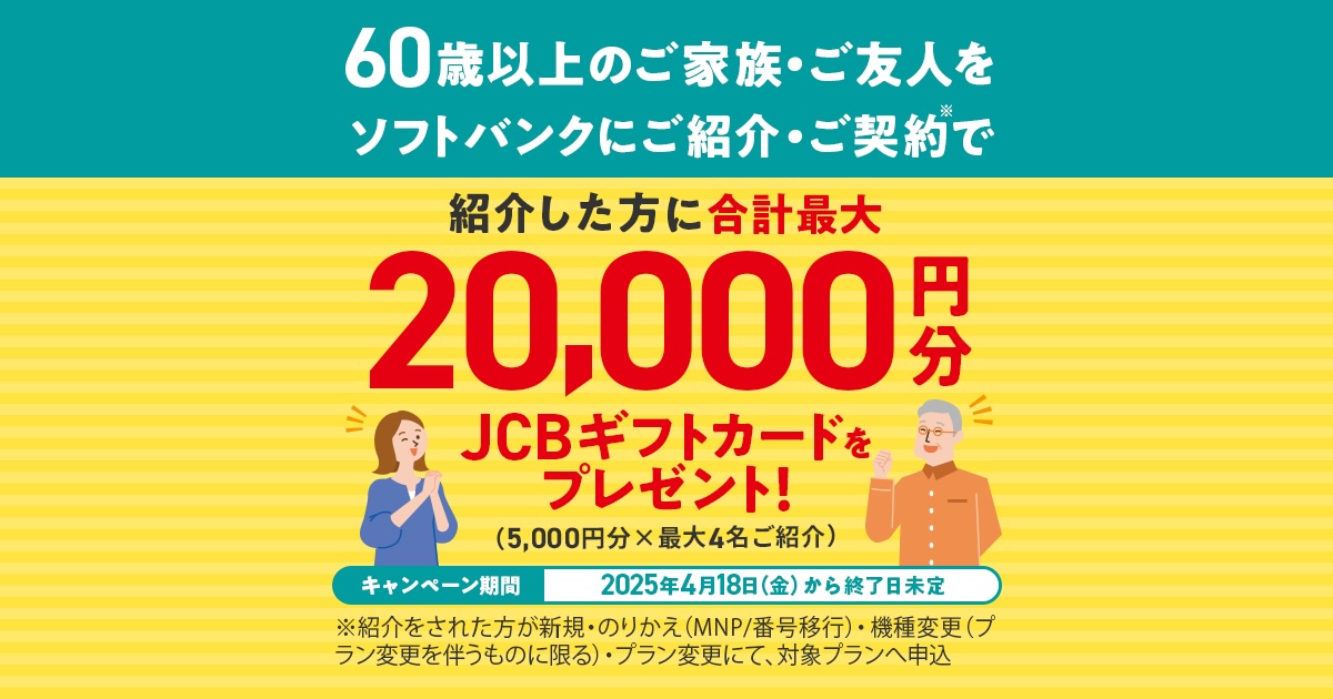 ・紹介した方に合計最大20,000円相当の商品券をプレゼントする「60歳以上の方ご紹介キャンペーン」を開始 | スマートフォン・携帯電話 | ソフトバンク