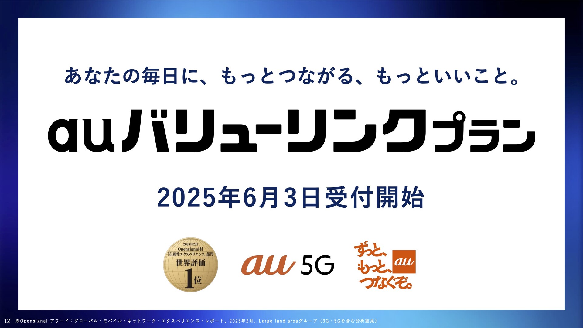 KDDIおよび沖縄セルラーは7日、都内およびオンラインにて「KDDI 新サービス発表会」を開催し、携帯電話サービス「au」における新料金プラン「auバリューリンクプラン」および「auマネ活バリューリンクプラン」を2025年6月3日(火)から提供すると発表しています。また「auバリューリンクプラン Netflixパック(P)」や「auマネ活バリューリンクプラン Netflixパック(P)」をはじめとした動画や音楽などのサービスがセットになった料金プランも同日から提供開始されます。