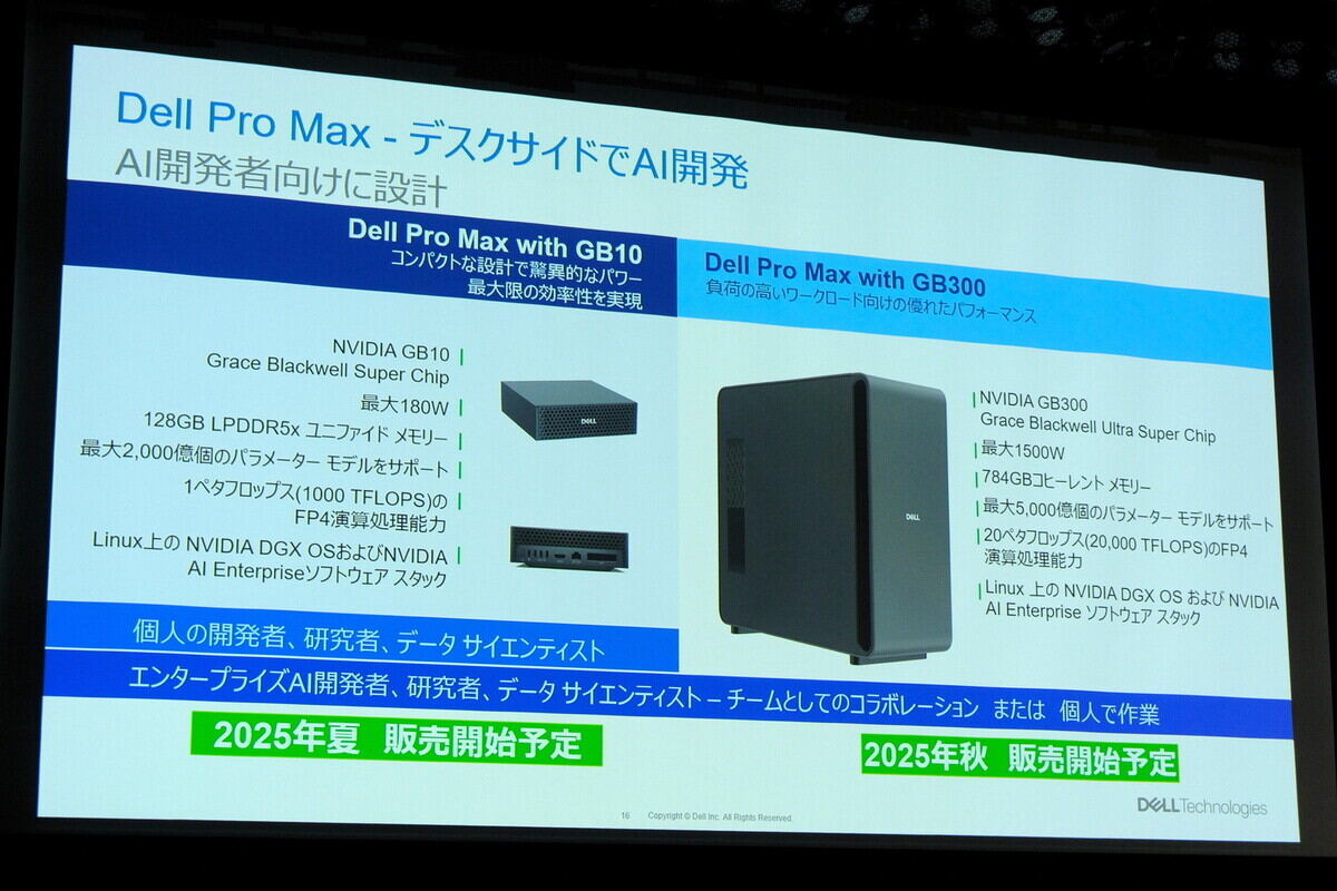 湊真吾氏はDell Pro Maxシリーズにおける新製品情報について紹介したほか、AI開発向け製品としてNVIDIA製チップを採用する「Dell Pro Max with GB10」「Dell Pro Max with GB300」を今年中に発売すると発表。一部Dell Pro Max PlusノートPCにはQualcomm製のディスクリートNPU搭載も予定するとしており、AI開発を強力に推し進めていく姿勢について明らかにしました。