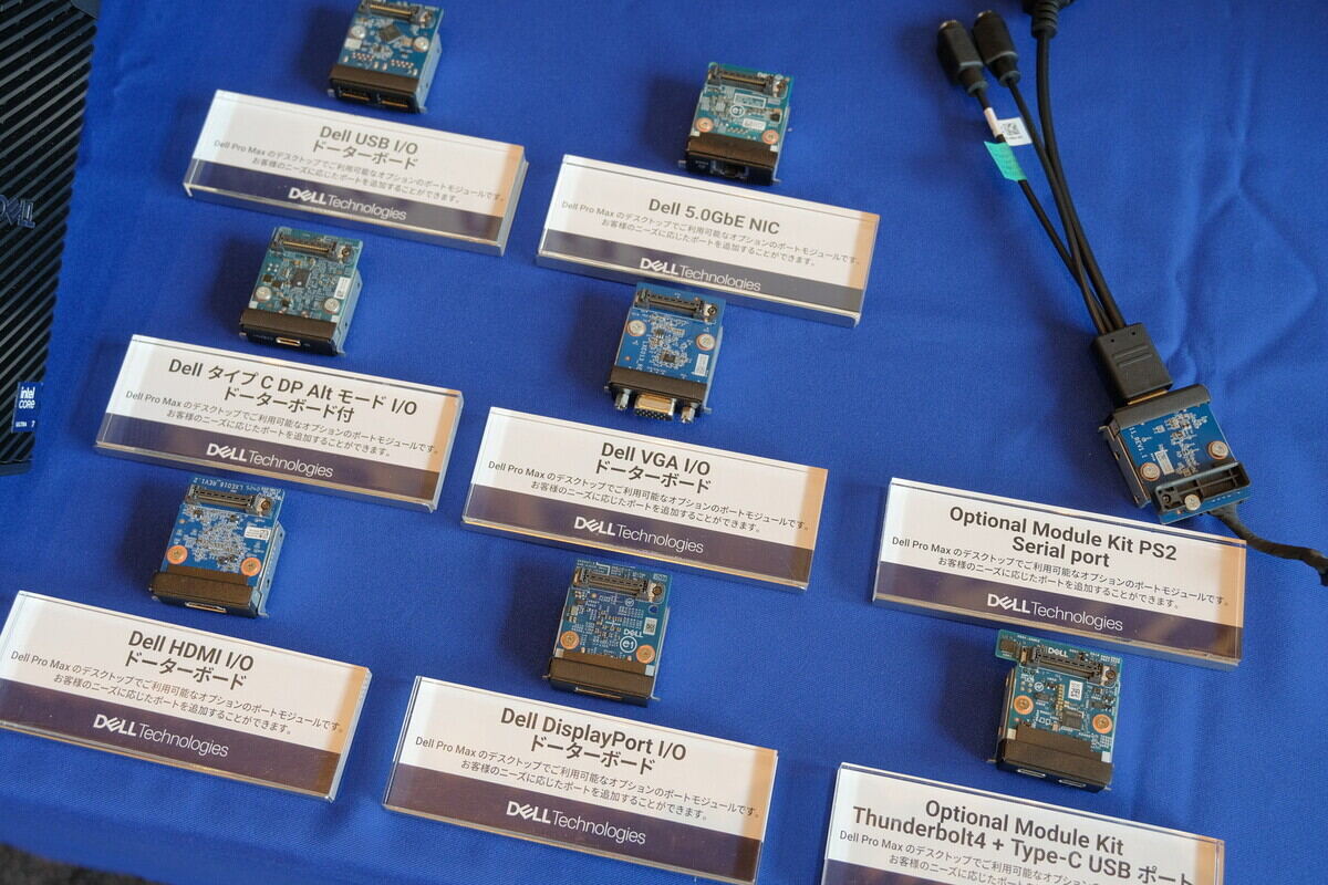 このほか、会場には修理のしやすさを高めて環境負荷を低減するドーターボード採用モデルの展示がありました。必要なインタフェースをドーターボードのみの変更で搭載でき、製品仕様の共通化にも貢献しているとのこと。PS2 SerialポートからThunderbolt 4まで幅広く対応できるといいます。