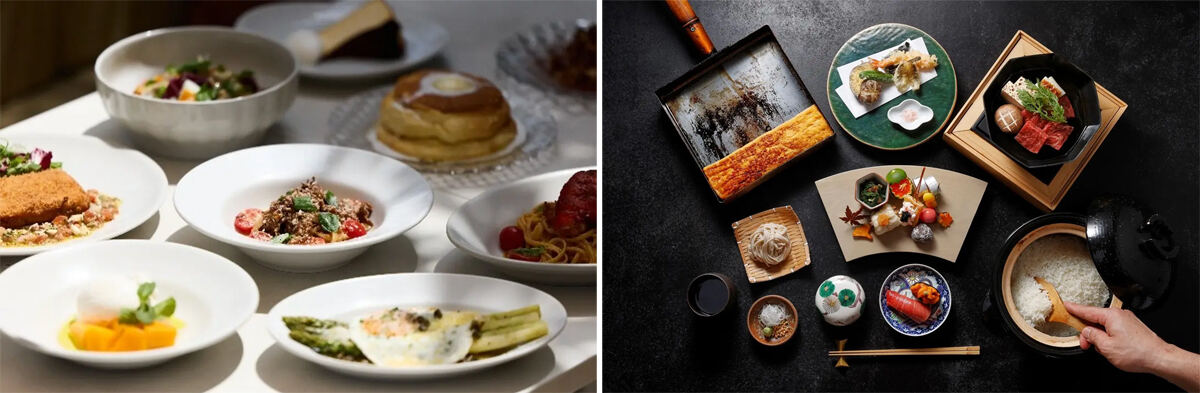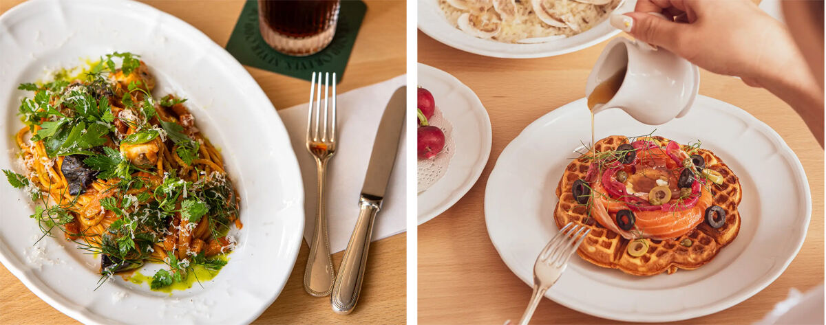 左:「クラフトケチャップのハーブナポリタン」(1,600円)/右:「スモークサーモンとハーブクリームのノルウェーワッフル」(1,500円)