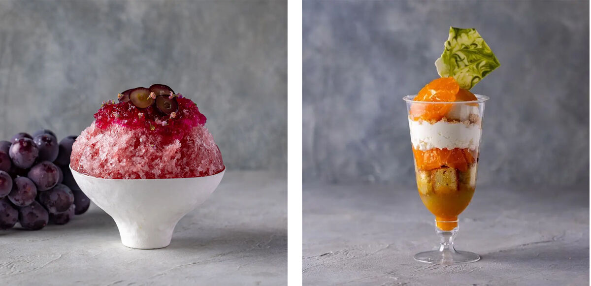 左:「クラフトかき氷(SAKEICE×赤しそぶどう)」(1,500円)/右:「宵パフェ(よいぱふぇ)(みかんと緑茶)」(1,200円)