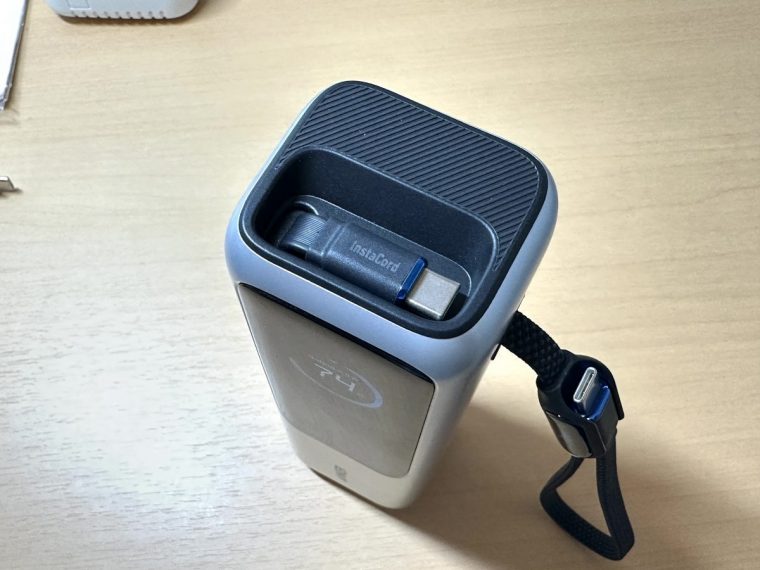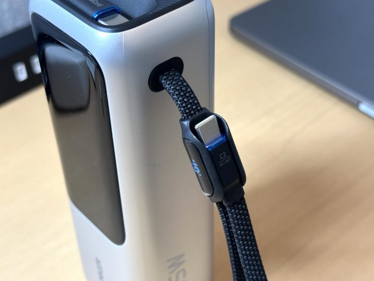 Anker Power Bank(25000mAh、Built-In&巻取り式USB-Cケーブル)は本体に2本のケーブルが付いていて、わざわざケーブルを持ち運ばなくて良いのが魅力的。巻取り式USB-Cケーブルは約70cmまで伸びます。2万回以上の巻き取りに耐えられる高耐久設計になっているとのこと。
