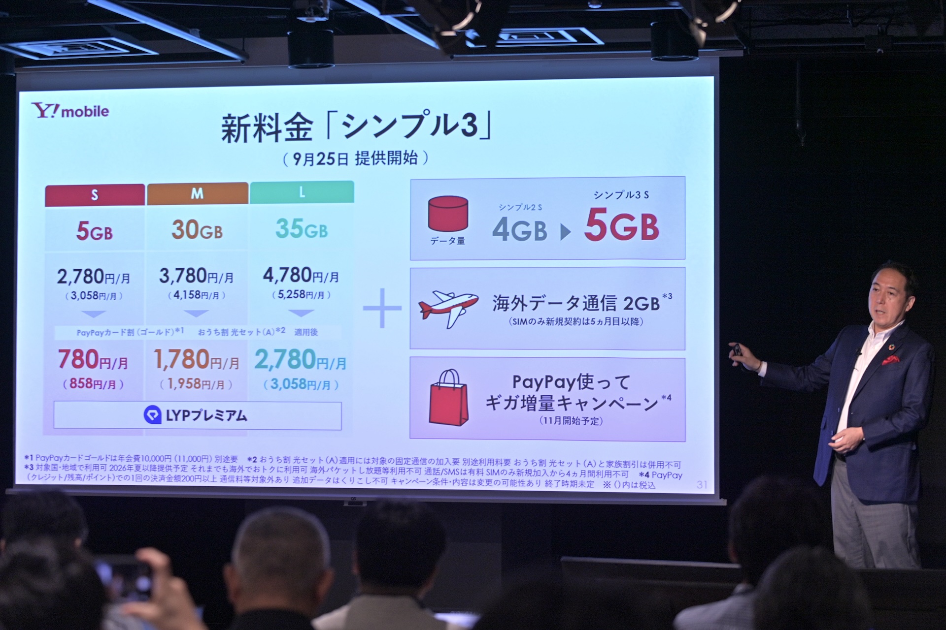 ソフトバンクは4日、都内およびオンラインにて「“ワイモバイル”の新料金プランに関する説明会」を開催し、携帯電話サービス「Y!mobile(ワイモバイル)」における新料金プラン「シンプル3」を発表しています。2025年9月25日(木)に提供開始され、合わせて既存の「シンプル2」は9月24日(水)に新規受付が終了となります。ただし、シンプル2の利用者はシンプル3の提供後もそのまま利用できるとのこと。