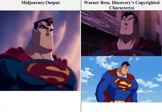 事例の1つ。左がMidjourneyの出力した画像、右がWBDが権利を有するスーパーマンの画像です。
