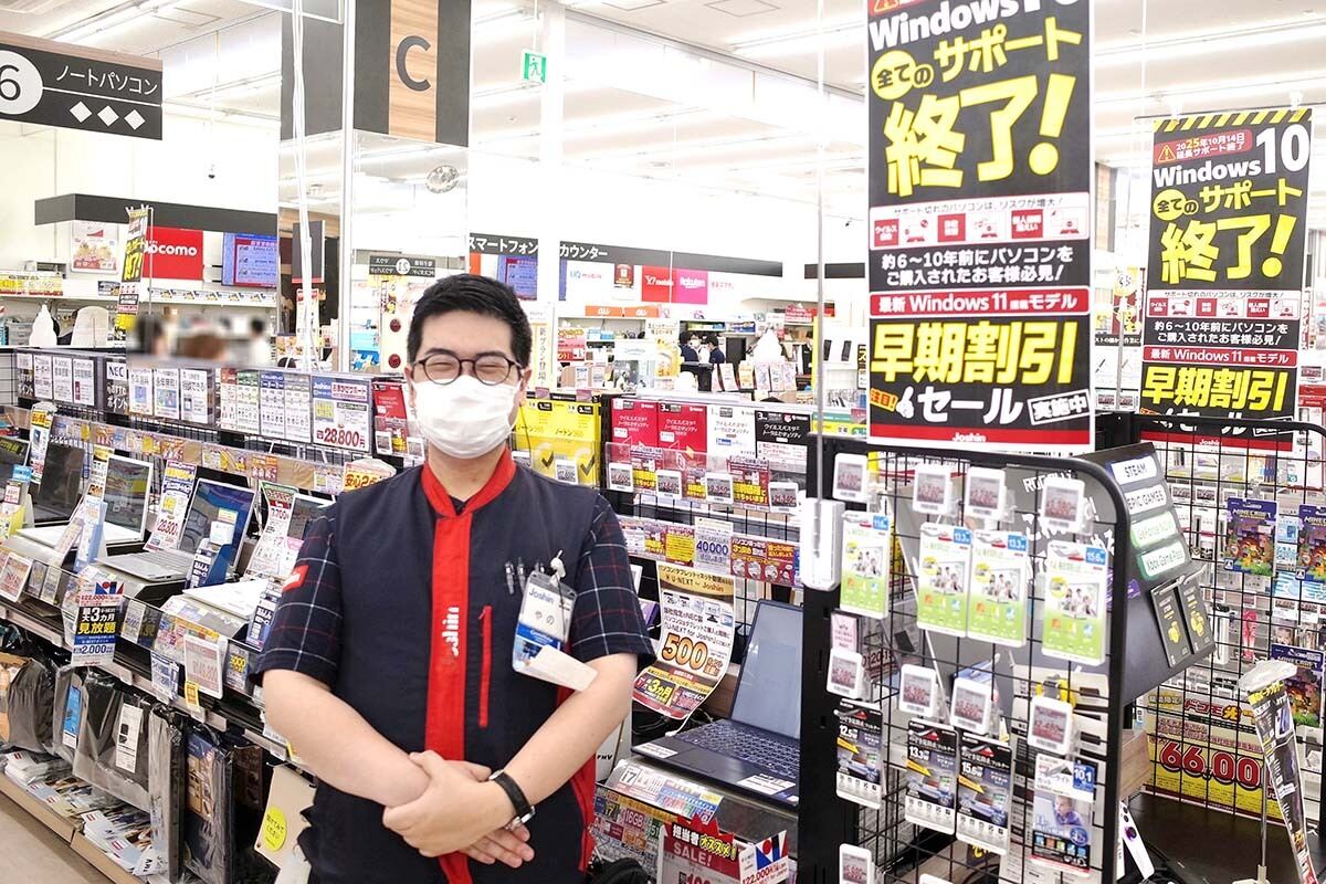 「Windows 10 サポート終了!」のPOPが目を引く、ジョーシン浦和美園イオンモール店のパソコン売り場。矢野湧也氏に案内してもらった