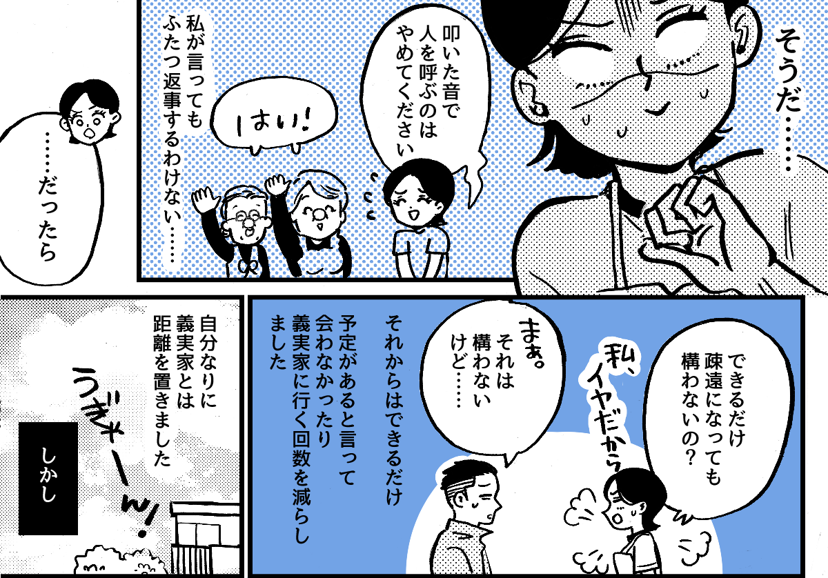 根付いた習慣であんな動作で人を呼んでいるとして、それが成り立っているのはまわりの人の配慮のおかげ。私が不快な思いをしているのは事実なので、それからは義実家とはなるべく距離を置いて付き合うようにしたのです。しかし月日が少し経って……義実家を疎遠にできない状況になったのです。