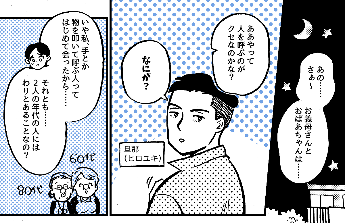 旦那の話だと、義祖母は昔、お手伝いさんがいるようなご家庭の方だったそうです。その名残でいまもあんな動作をするってこと? そうだとしても、やっぱりあの動作はいまの時代に合わないと私は思うのです。