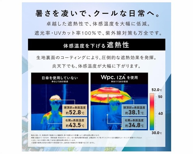 生地裏面のコーティングにより、圧倒的な遮熱効果を発揮。炎天下でも体感温度が大幅に下がる。また、体感温度が下がることで汗の量も大幅に低減し、汗ジミなどを抑えて快適に過ごせる。