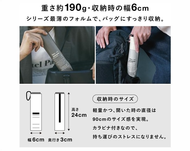 Wpc.から、重さ約190グラム/収納時の横幅約5センチメートルと、大きさと軽量を兼ね備えたスリムなフォルムの晴雨兼用傘が登場!軽量でありながら、開いた時の直径は約90センチメートルと男性でもしっかりカバーしてくれるサイズ感を実現。ワンアクションでスムーズに開閉できる、便利な逸品だ。