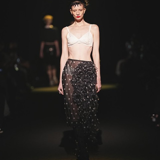 1920〜60年代のクチュールやヴィンテージアイテム、さらに70年代のスポーツスタイルが着想源となった今季。レースで覆われたテーラードジャケットはミニドレス風に仕立てられ、ネグリジェを思わせるふんわりとしたトップスからはランジェリーが透けて見え、官能的な表情をのぞかせます。中盤には「CIRCOLO 87」のロゴを配したアイテムが登場し、スポーティさとクラシックが交差するスタイルを提示しました。異なる時代や要素を自由に組み合わせることで、ロマンティシズムの新しい輪郭が浮かび上がります。