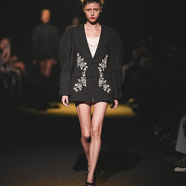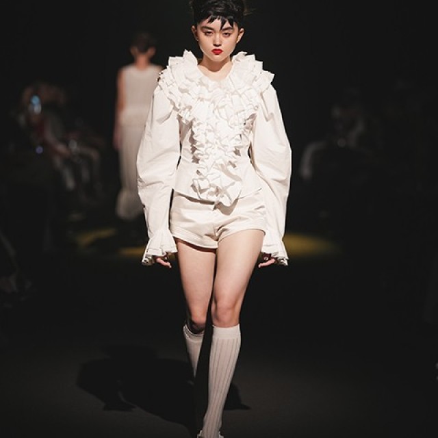 テーマは「Neo Romanticism(新しいロマンティック)」。デザイナーのViviano Sueが提示したのは、甘美な装飾にとどまらないロマンティックの形です。色を削ぎ落とした静謐の中でこそ際立つ、クチュールライクな構築、刺繍のひと針、布の揺らぎ。そのひとつひとつに“静かな強さ”が宿り、観る者に深い余韻を残しました。