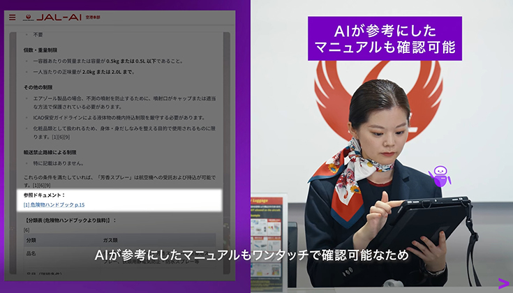また、AIはマニュアルのどの部分を参照して回答を出したかをワンタッチで明示する機能もつけ、スタッフ自身でもAIの回答の信用度を確認できるようにした。