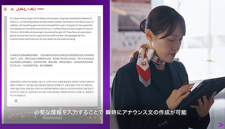 また、「イレギュラーアナウンス文作成」では、航空機の遅延や変更、搭乗口の変更など、急な場内アナウンスが必要になった際、複雑な状況説明を多言語で翻訳する作業が迅速に求められ、現場に大きな負担がかかっていた。