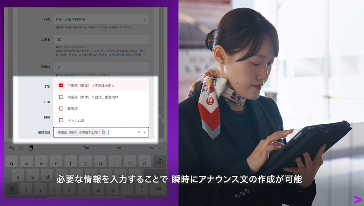 イレギュラーアナウンス文の作成と多言語での音声アナウンス(搭乗カウンター)