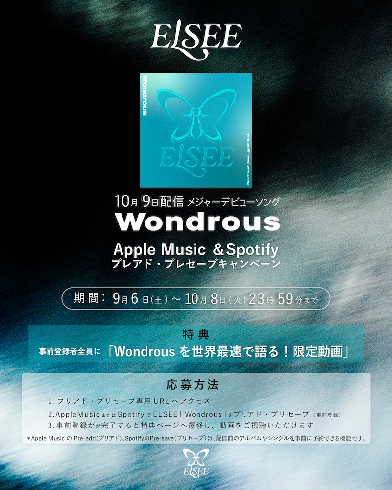10月9日の楽曲配信日に先駆け、iTunes Store、Apple Music、Spotifyを対象とした予約注文がスタートしており、iTunes Storeでは応募者全員に「ELSEEメンバーからあなたへの限定メッセージボイス」、Apple MusicとSpotifyでは「Wondrousを世界最速で語る!限定動画」が特典となっているので、ぜひチェックしていただきたい。