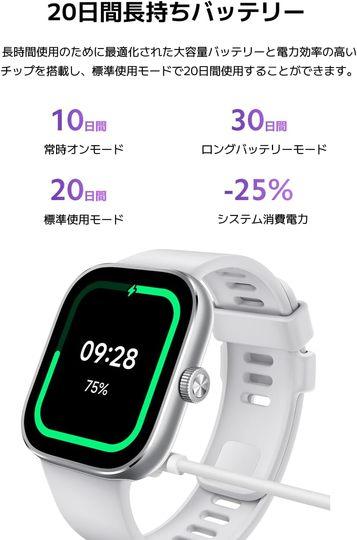 「Redmi Watch 4」は、長時間使用のために最適化された大容量バッテリーと電力効率の高いチップを搭載し、標準使用モードで最大20日間のバッテリー持続時間を実現しています。