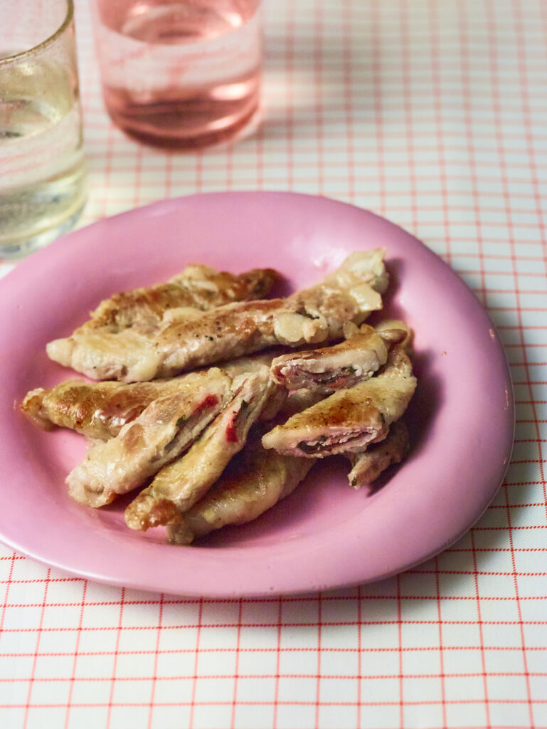 フライパンにサラダ油を弱めの中火で熱し、1を並べ入れる。肉の上にアルミホイルをかぶせ、フライパンよりひとまわり小さい重し(鍋ぶたなど)をのせる。ときどき押さえながらそのまま2 分ほど焼き、上下を返して同様に2 分ほど焼く。