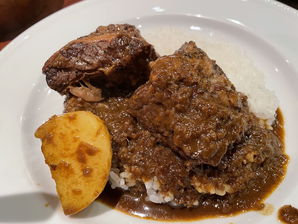 皿に盛り付けられたご飯とソースポットのカレー。ご馳走感ある佇まいの中にはゴロッと存在感のある大ぶりなビーフ角切りとポテト。ダブルだとそのビーフが2つ。シャバッとしたテクスチャのカレーはビターかつスパイシーな昔ながらのインド風カレーライスの趣。