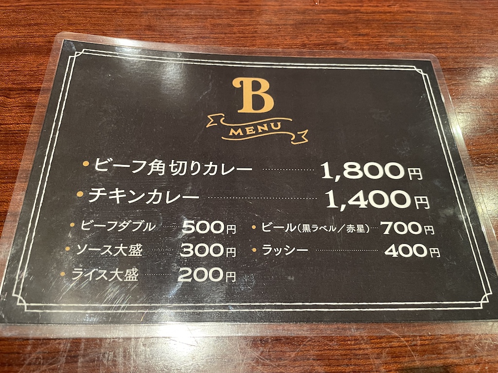 メニュー数はグッと絞ってビーフかチキンの2択。昔から大好きな「ビーフ角切りカレー」1,800円を「ビーフダブル」500円追加でいただきました。