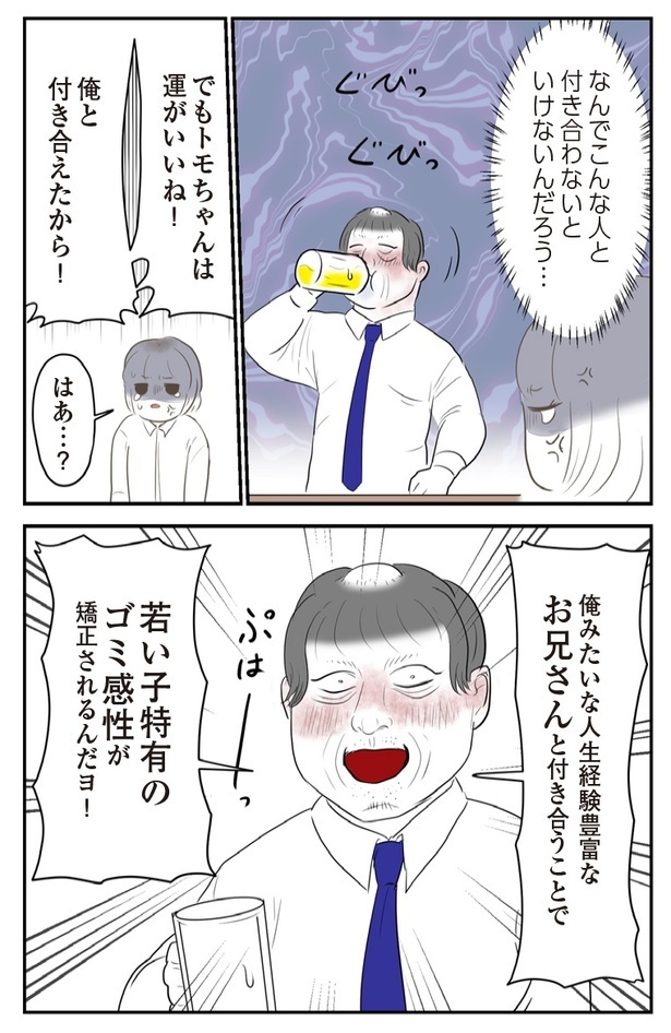 世間を知らなかった尾持さん。さらに彼氏と別れたばかりで、恋愛をする気がなかったこともターゲットになった理由かもしれない。社員ぐるみで52歳独身男性の嫌田さんと付き合うように囲まれ、逃げ場のないところまで追い詰められていく。結果、2人で食事に行くことになるが、趣味のK₋POPやアニメも否定され、30歳以上違う世代間のジェネレーションギャップは激しく会話は続かない。さらに「俺みたいな人生経験豊富なお兄さんと付き合うことで、若い子特有のゴミ感性が矯正されるんだよ」と、斜め上の発言にげんなり。