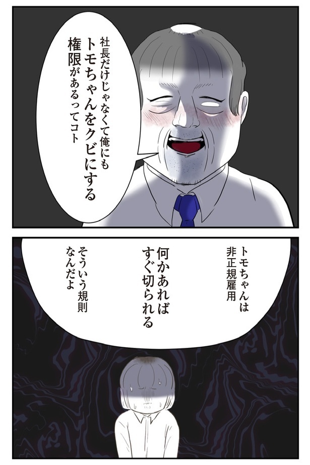 性格、言動、人間性のすべてに嫌悪感がわき、「帰る」と言った尾持さん。しかし「事務課の先輩たちにいろいろ言われて、会社に居づらくなるねぇ〜」「非正規だから何かあればすぐ切られる」と脅してくる。「あのときはクビになったら生きていけない、新しい会社に就くのも簡単じゃない。どうしようとパニックに陥りました。」逃げられないように囲われていき、尾持さんは恐怖をおぼえた。