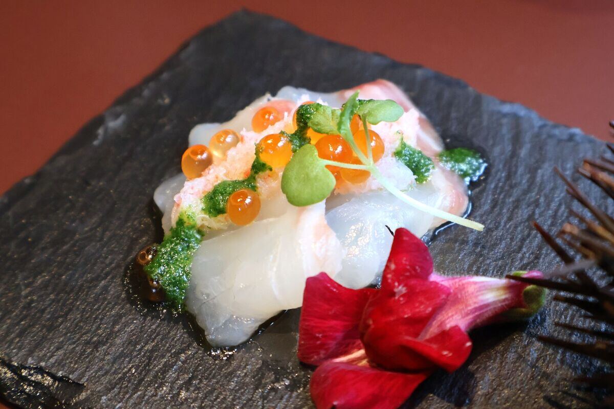 真鯛のカルパッチョの上にはズワイガニが乗っている