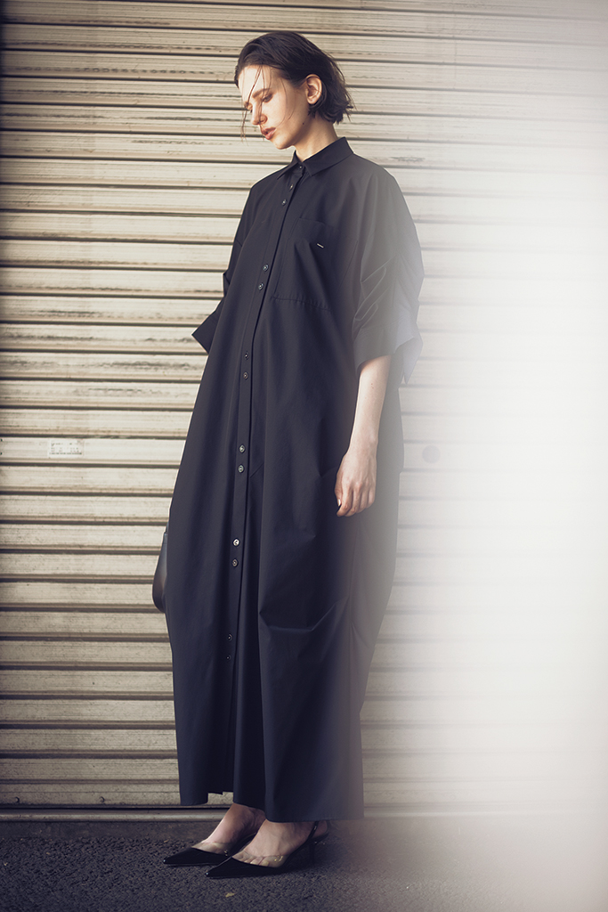 サイドをつまんだような構築的なフォルムと、横顔や後ろ姿まで美しく見せる計算されたドレープ。あいまいなそで丈や落ち感のある素材のニュアンスによって、モード手前のバランスに。ワンピースに特徴があるぶん、小物も黒で統一。