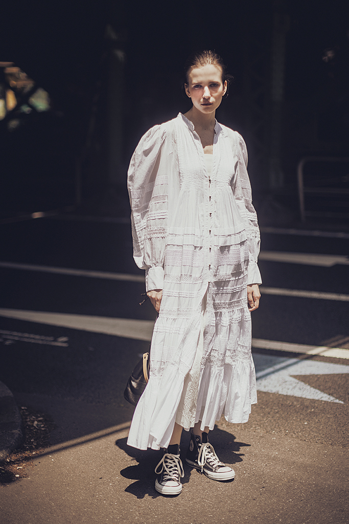 白ボリュームロングワンピース/カオス(カオス表参道) 巾着バッグ/Marie-Louise(ラヤン) スニーカー/CONVERSE(コンバースインフォメーションセンター)