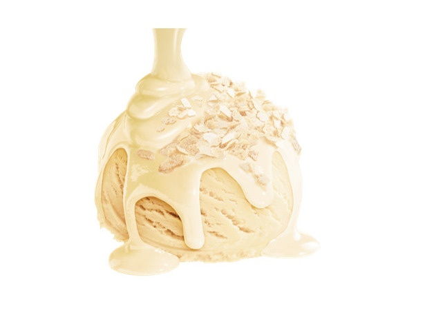 このアイスクリームの中には、柑橘系の洋酒が香るホワイトチョコソースが入っていて、アイスクリームの味わいに華やかさをプラスしてくれる。