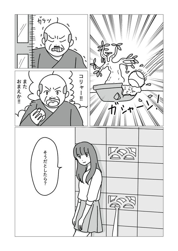 「ボールが飛んできて大事な盆栽が割られ、雷親父がわんぱく坊主を叱る」という、昭和の漫画によく見られた光景。しかし、犯人はわんぱく坊主ではなくかわいい女の子で、意味深な一言を発する…。