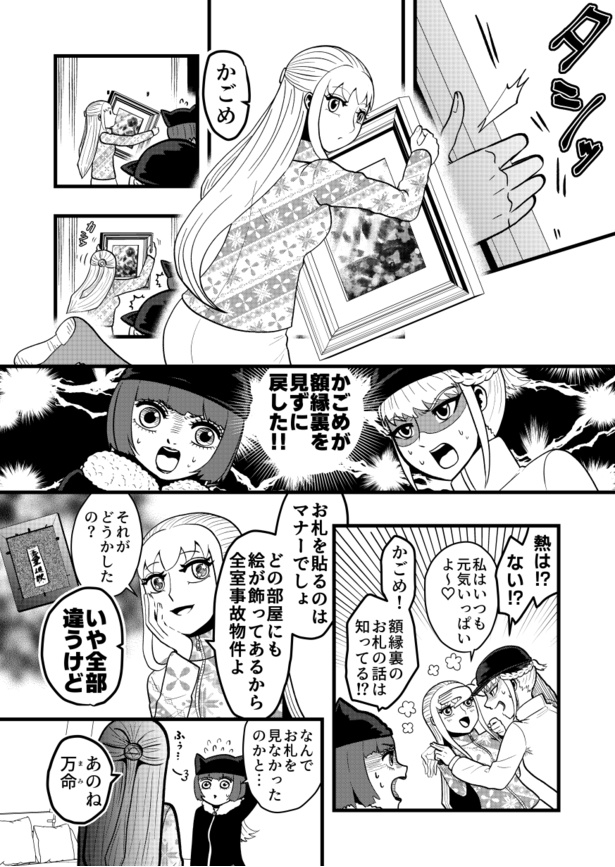 するとかごめが危機一髪でその絵を受け止め、額縁裏を見ないでそのまま壁に掛け直した。かごめの意外な行動に友人たちが驚くと、かごめは「御札を貼るのはマナーでしょ。どの部屋にも絵が飾ってあるから全室事故物件よ」と言うではないか!