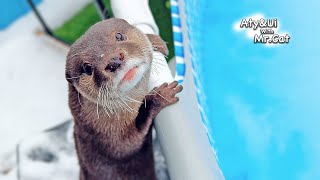 カワウソのアティくんとういちゃんは、自宅の庭のプールを前に「鮎、ちょうだい!」と大騒ぎ。飼い主のオッターマンがプールに二匹の鮎を投げ入れるのですが、なんとプールには薄い氷が張っています。