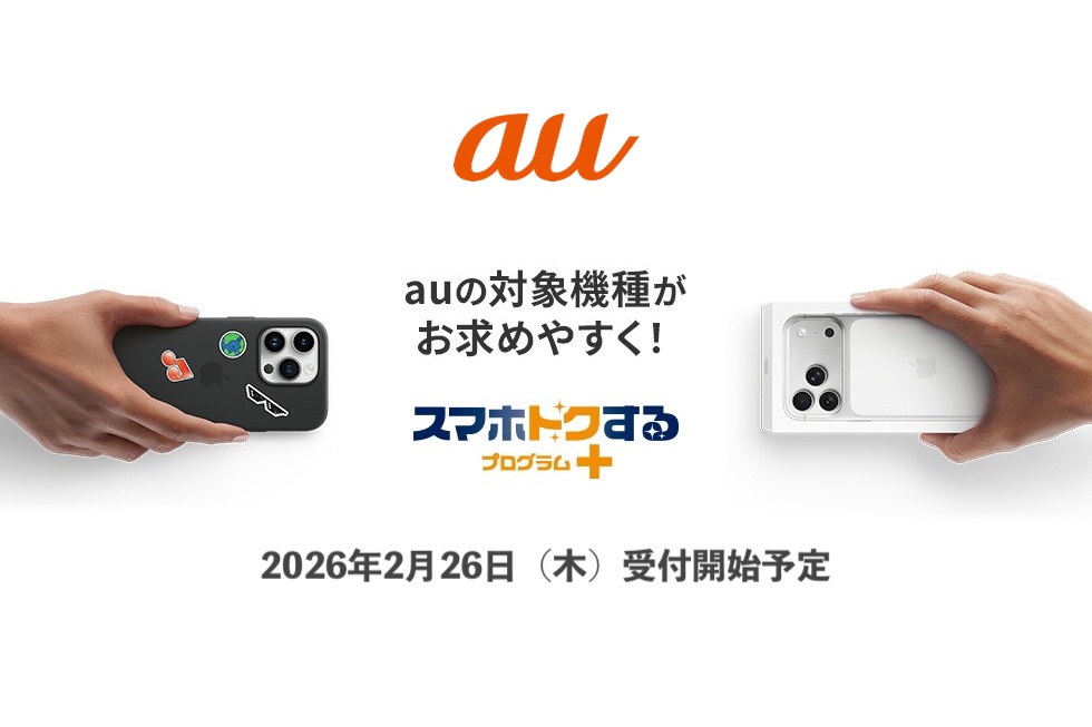 KDDIおよび沖縄セルラー電話は18日、携帯電話サービス「au」においてスマートフォン(スマホ)をお得に購入できる新たな販売施策「スマホトクするプログラム+」の提供を2026年2月26日(木)から開始すると発表しています。なお、スマホトクするプログラム+の開始に伴い、2026年2月25日(水)をもってauにおける既存の「スマホトクするプログラム」対象機種の取り扱いを終了するとのこと。