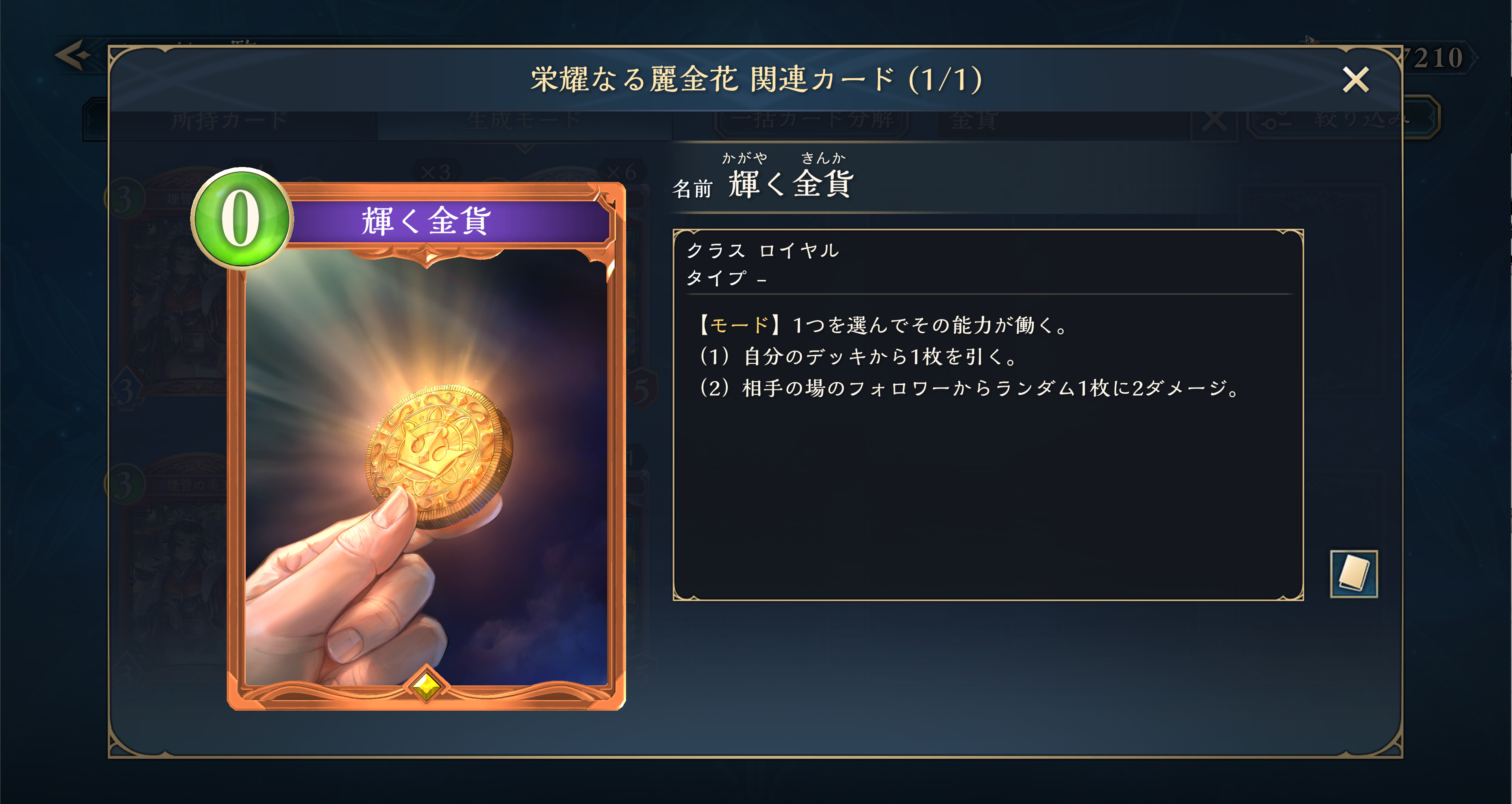 他にも類似能力を持つロイヤルのカードとしては他にも「輝く金貨」があげられる。「輝く金貨」は「麗金花・ウンケイ」など他カードの能力でのみ手札に加えられるカードだが、0コストでランダム2ダメージか1ドローを選べる非常に近い使い勝手のカードだ。「輝く金貨」を手札に加えられるカードや、「返還の剣閃」と合わせて採用することで、安定したドロー&除去を狙うこともできそうだ。