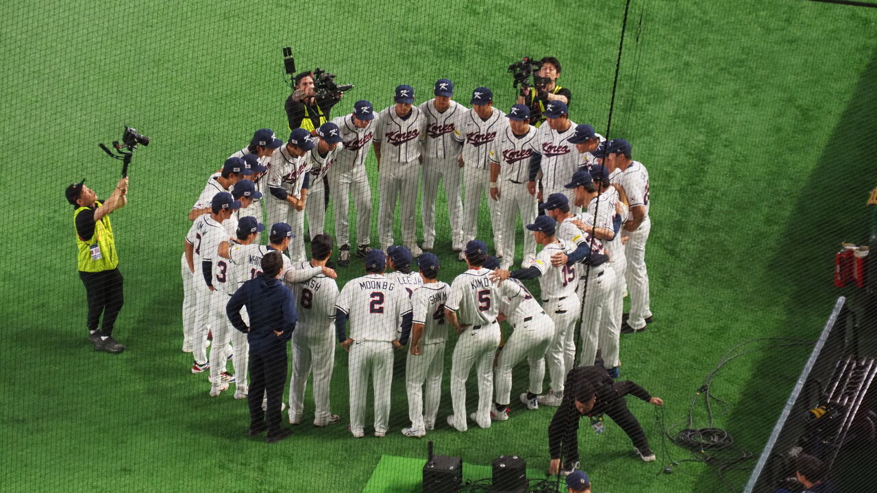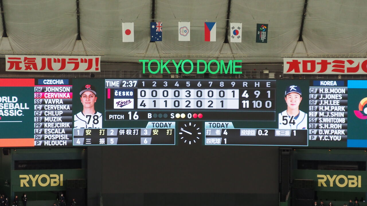 そそくさと着席しますと、すでに場内では試合前のイベントが行なわれています。東京プール参加各国の国旗が広がるなか、レーザー光線的な演出で「JAPAN」などの文字も描かれています。火花とともに入場する選手たちやKーPOPスターを招いての始球式、両国国歌の演奏など行ないますと、もう試合開始の時間です。韓国は大きな円陣を組んで必勝を期し、チェコもギュッとした円陣で気合を入れ、いよいよ「世界の野球」の始まりです。