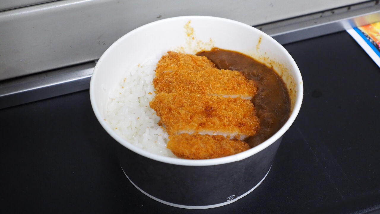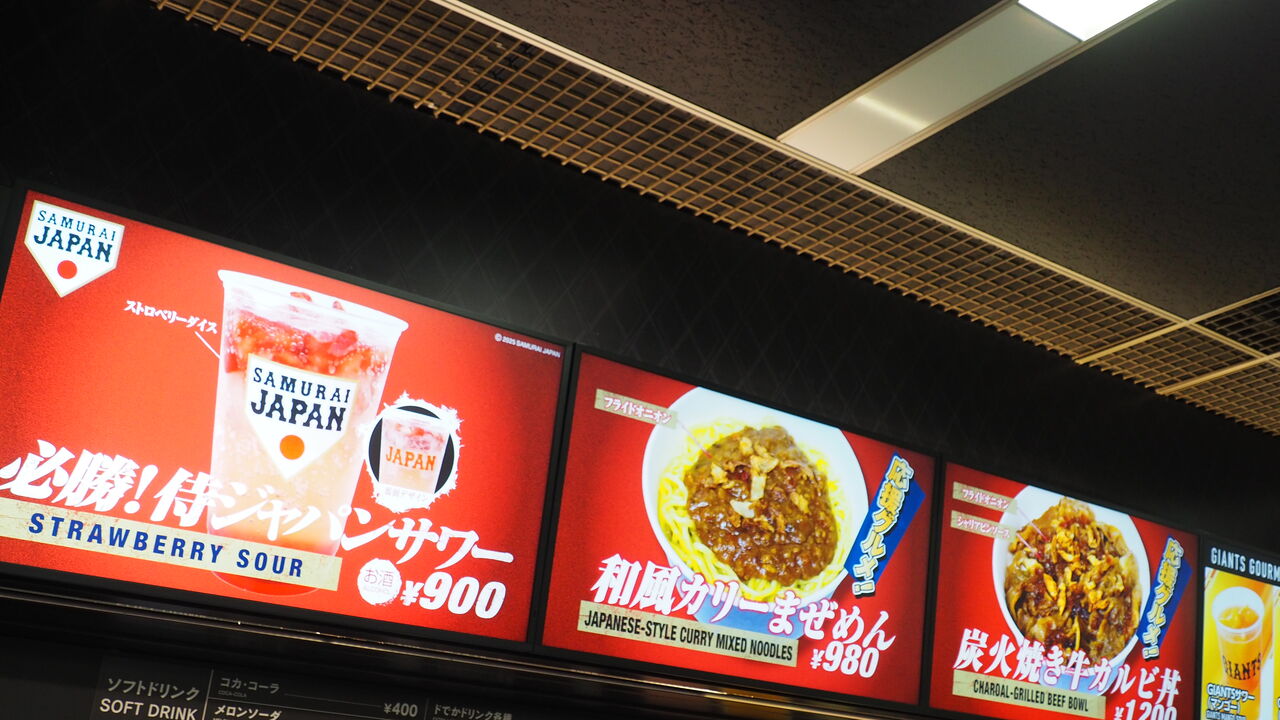 場内に入りますと、まぁこちらもアッサリしたもの。入った瞬間に大量のチラシとか渡されて、何なら謎解きイベントくらいあるんじゃなかろうかと思ってきたのですが、そういうのはまったくありません。入場したら飲食系の買い物などして真っ直ぐ着席、それぐらいのスピード感です。何よりも大事な試合に集中しようじゃないかという骨太さは、真剣勝負の国際大会ならではかもしれませんね。僕もせっかくなのでWBC応援フードで腹ごしらえをすることにしまして、いくつかメニューがあるなかから「絶対勝つ!カレー」なるカレーをいただきました。