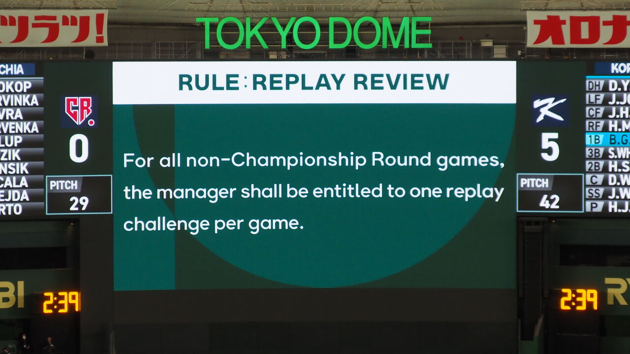 試合はというと、こちらも初回から派手な展開です。1回裏、韓国はいきなりの満塁ホームランで4点を先制。その後もコンスタントに得点を重ねて優位に試合を運んでいきます。チェコもお返しのスリーランホームランなどで反撃を見せますが、やはり地力に勝るのは韓国のようで、ジワジワと点差は広がっていきます。幕間には「7回10点差だとコールドゲームになります」みたいなルール説明も流れてくるのですが、その辺りもチラリと意識するような展開です。