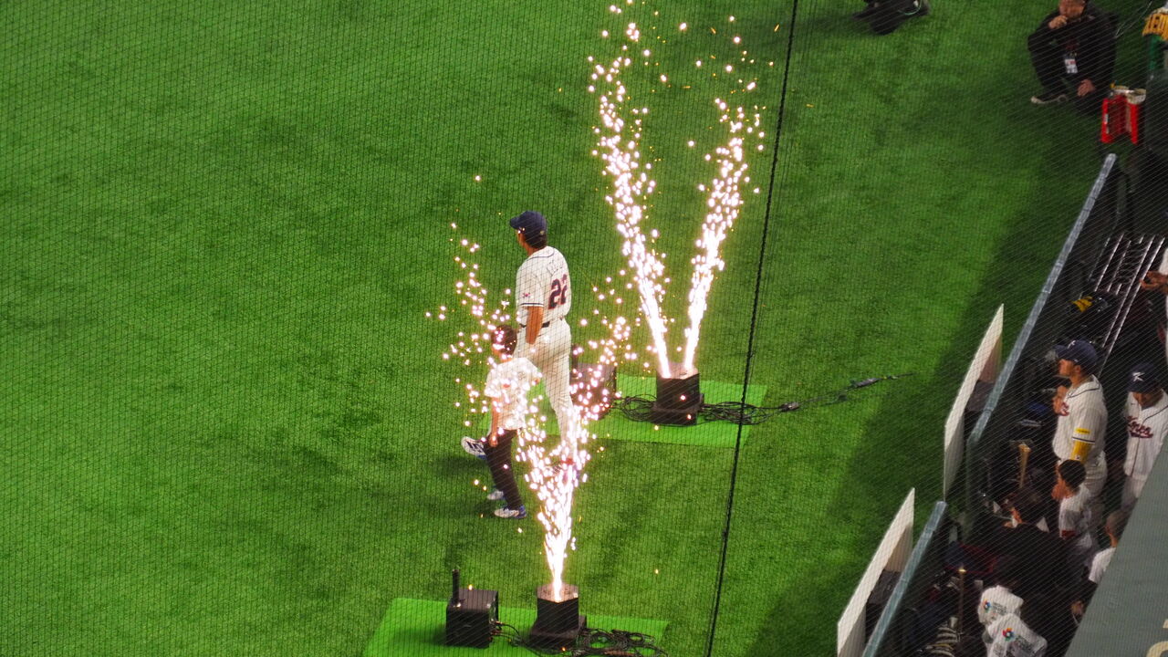 国際大会ということで、試合中も大型ビジョンやら場内アナウンスやらは英語が主軸となっており、雰囲気があって大変よい観戦体験です。満塁ホームランのときに「GLAND SLAM」なんて表示されるとアメリカンな感じで気分もグッとあがってきます。まぁ、そうは言っても大半が日本のお客さんという現実も見据えているのか、「グランドスラム」とか「ホームラン」とかそのまんまだから確実に通じるだろうというあたりは英語で表示しつつも、「盗塁」とか「ホームイン」とか英語にしたら分からない人がいるかもしれないという単語はそのまま日本語で「盗塁」とか「ホームイン」とか出してきたりしていたので、そこはもうちょっと振り切ってもいいのかなと思いました。