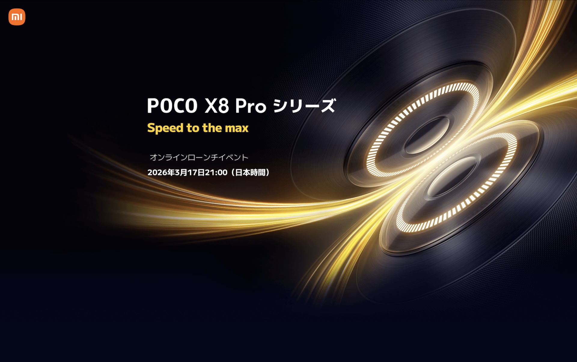Xiaomiは9日(現地時間)、同社傘下のPocoが展開している「POCO」ブランドにおいてグローバル向け新製品発表イベント「POCO X8 Pro Series Launch Event - Speed to the max」( https://www.mi.com/global/event/2026/poco-x8-pro-series-preheat/ )を現地時間(CST)の2026年3月17日(火)20:00から開催すると案内しています。イベントはオンラインにて行われ、日本時間(JST)では同日21:00から。