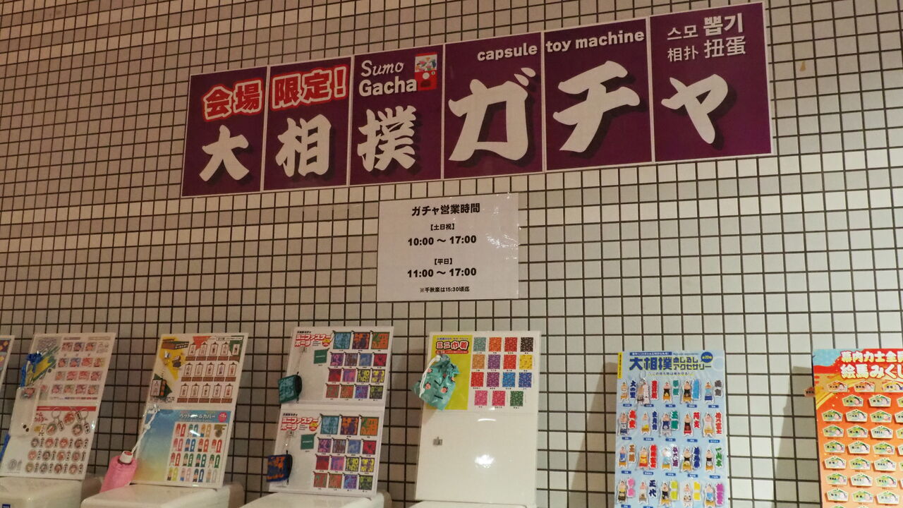 お腹が膨れたところで次は売店の物色です。国技館では外周のコンコースに沿っていろいろなお店が展開されておりますが、こちらではスペースのあるところ…何となく各階の四隅とかにお店が設けられている模様。ロビーからつづく1階スペースには親方衆が会計をしてくれることでおなじみの公式売店「すも〜る」や大人気のガチャコーナーなどが設置されています。国技館にあるお店から厳選するとこうなるだろうな、というラインナップ。十二分な構えです。