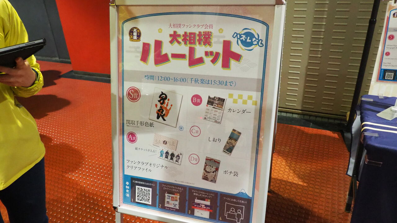 入場口へと向かうエントランス部を活用してお茶屋さんが立ち並んでいたり、フォトスポットが用意されていたりと、チケットをもぎる前から相撲の雰囲気を楽しめるのもいい感じ。入場口には「暴力団お断り」の張り紙であったり、親方衆がチケットをもぎってくれるシステムであったりがしっかり用意されていて、国技館とまったく遜色ありません。むしろ、最近QRチケットなどと言い出している国技館よりも「木戸」で紙をもぎることを徹底している大阪のほうが情緒があるとさえ言えるほどです(情緒と不便は両立するが…)。