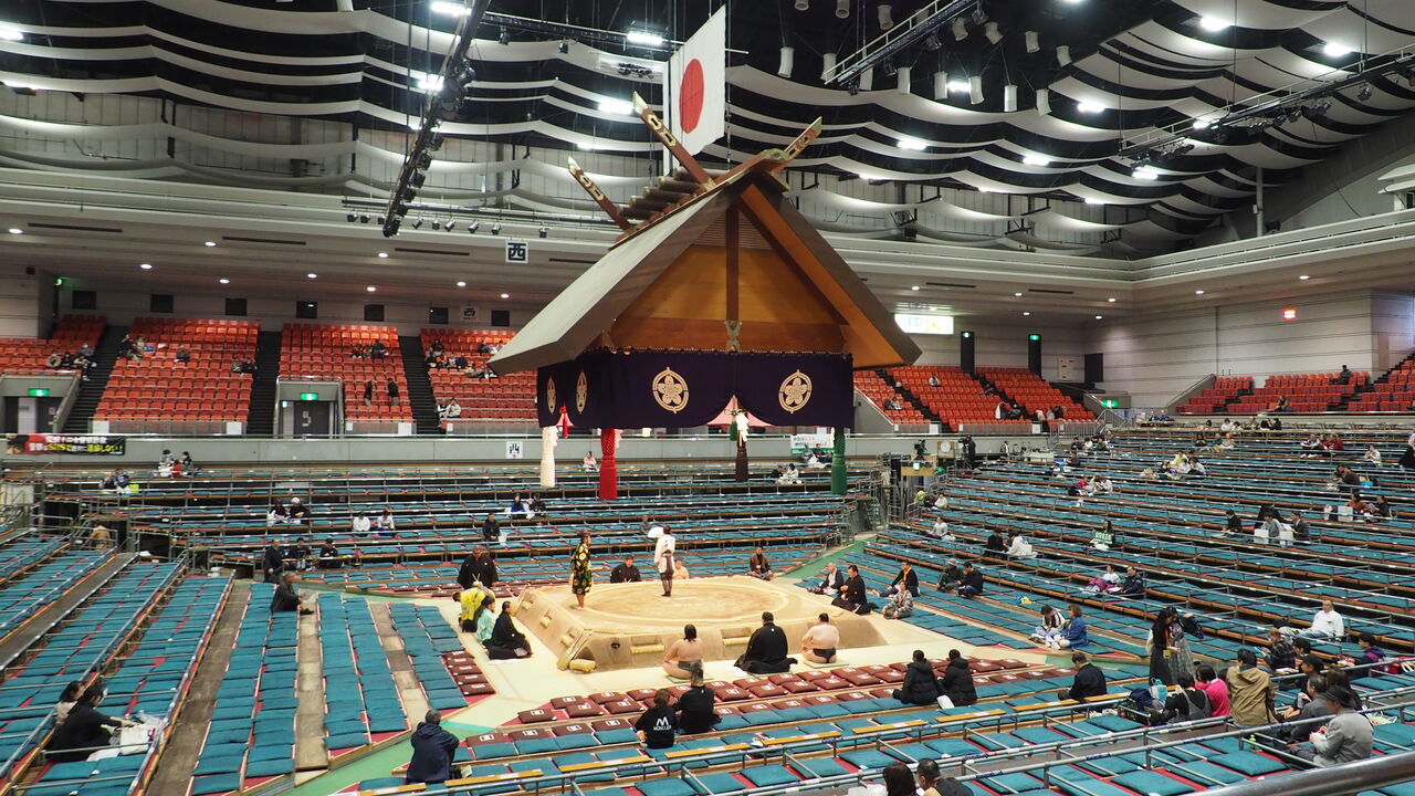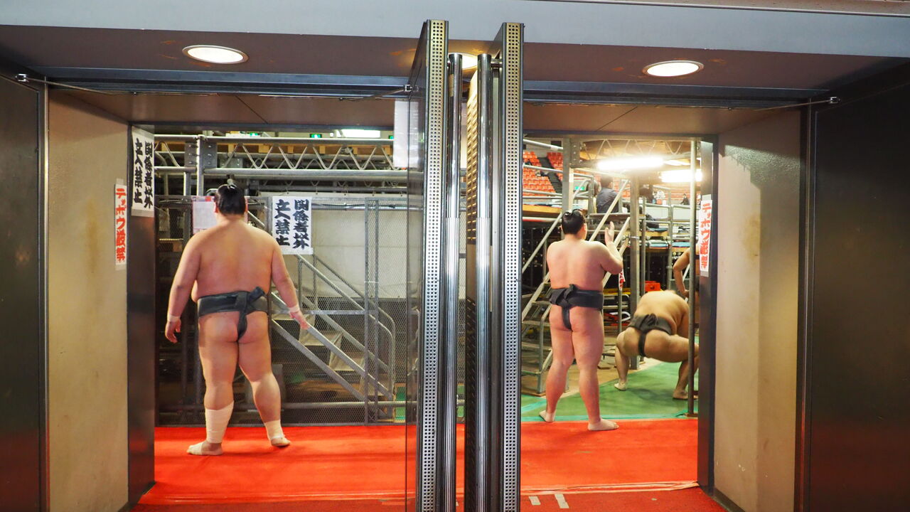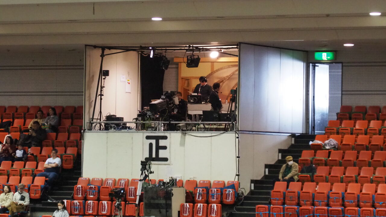 場内では工事現場の足場みたいなものを組んで、そこにマス席が設けられています。土俵を取り囲むマス席足場の外側には中継映像でもよく映る赤じゅうたんの通路があり、ようやく会場の全体像が理解できてきました。支度部屋から客前を通って会場内に入り、マス席足場の間にある赤じゅうたんの通路でウォームアップなどしながら、花道を通って土俵へと向かう、そんな流れがイメージできていろいろスッキリしました。