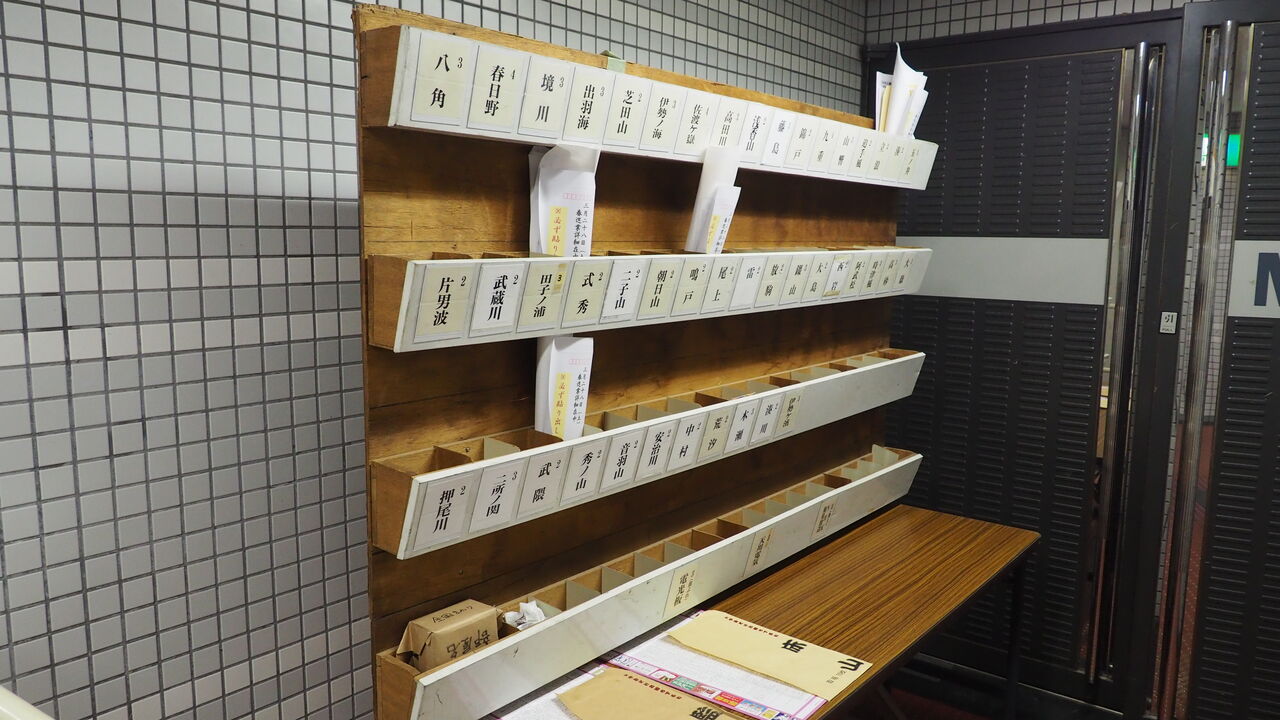 そして面白かったのが、会場の事情によるものなのでしょうが、いろいろな設備もその辺の小部屋に突っ込まれていること。本来なら支度部屋だのプレスルームだのはお客がいないエリアに設けたいところでしょうが、場所がないのでしょうね、その辺の通路沿いにいろいろな部屋が設置されています。映像をいろいろ見ている映像部、当日の取組表などを印刷していると思しき印刷所、広報さんが詰めている広報部室、さらには何らかの連絡網らしきポストもその辺に設置されていました。連絡の紙が飛び交っているところを想像して、ちょっとワクワクしました。