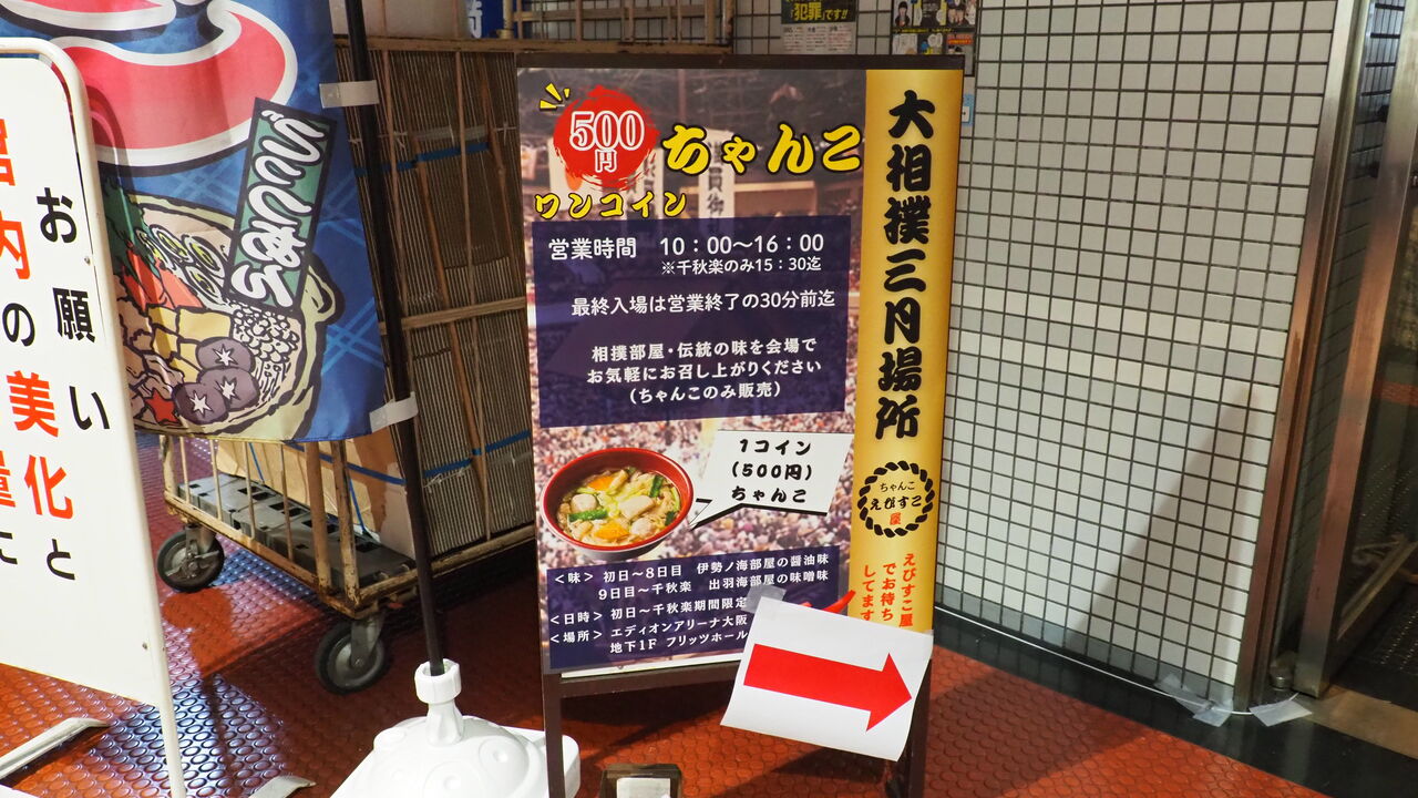 会場となるエディオンアリーナ大阪は思った以上に大相撲感があふれています。根本的には体育館アリーナなんだろうと思っていたものですが、カラフルなのぼりやらも立ち、門のような構えで現実世界との境界を設けていて、敷地に足を踏み入れればなかなかの異世界感があります。国技館のような相撲専用アリーナとは違って、限られたスペースにいろいろなものを展開していることから、いささかコンパクトで省スケールであることは否めませんが、いつもあるものは大体ある、立派な本場所です。