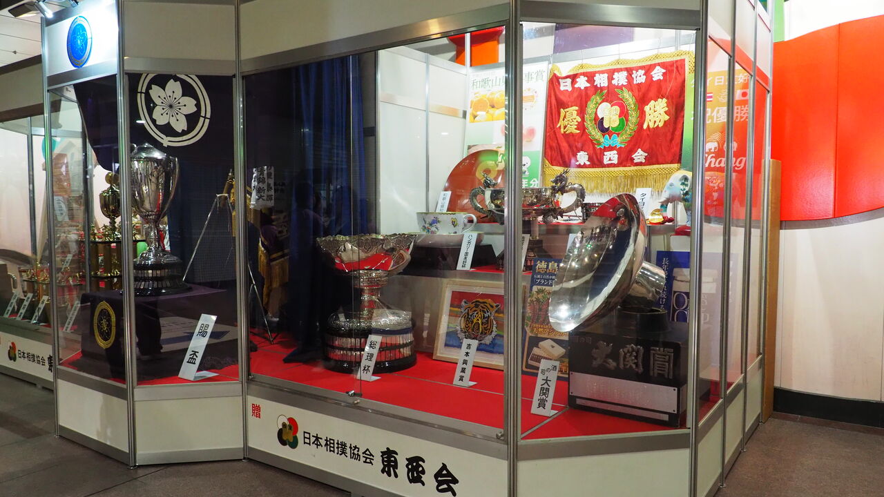 ロビーに入りますと、そこにはおなじみのトロフィー展示が。周囲には番付表の掲示やら横綱・大関の等身大的パネルやらも設置されており、早くも足を止めることに。独特な会場の作りに若干戸惑いつつも、場内を散策すれば「おなじみ」の催しが大阪でもしっかり展開されています。決して広くはない会場ですが、あらゆるスペースを活用して大相撲体験をさせようとしてくれているのはありがたいなと思いますよね。